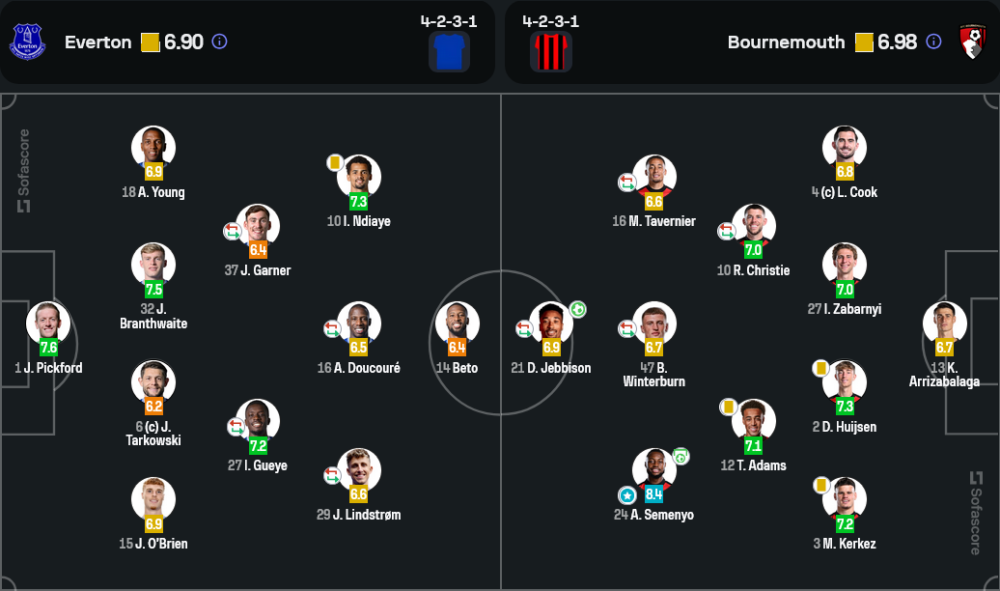 - กองกลาง: อิดริสซ่า กาน่า เกย์ (7.2), อับดูลาเย่ ดูกูเร่ (6.5), เจมส์ การ์เนอร์ (6.4), อิลิมาน เอ็นดิอาย (7.3), เจสเปอร์ ลินด์สตรอม (6.6)