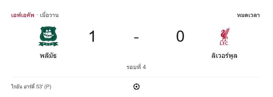 บ้านผลบอล สรุปหลังเกม พลีมัธ อาร์ไกล์ หักปีกหงส์! เฉือนลิเวอร์พูล 1-0 ลิ่วรอบต่อไปศึกเอฟเอ คัพ 2024