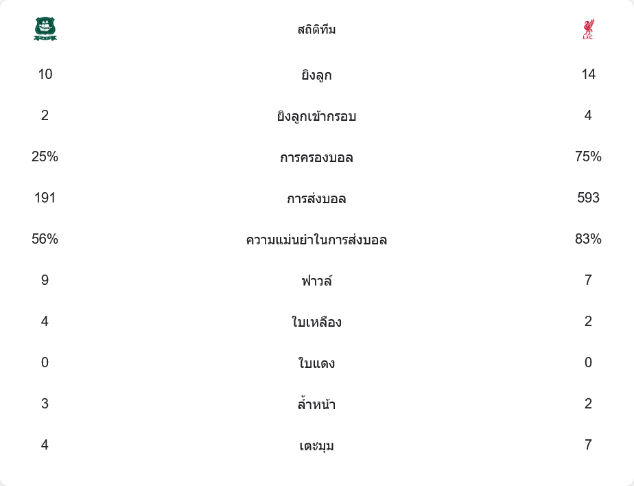 แม้ว่าลิเวอร์พูลจะมีเปอร์เซ็นต์การครองบอลที่เหนือกว่าถึง 75% แต่พวกเขาขาดความคมในจังหวะสุดท้าย การขึ้นเกมทางริมเส้นยังไม่ได้ผลนักเมื่อเจอการตั้งรับลึกของพลีมัธ ขณะที่เจ้าถิ่นใช้ระบบ 3-4-2-1 ที่เน้นการรับแล้วโต้กลับ และเล่นได้อย่างมีระเบียบวินัย