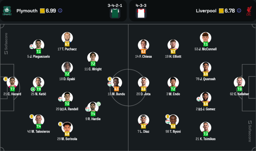 นิโคลา คาติช (7.9/10) – กองหลังของพลีมัธโชว์ฟอร์มสุดแกร่ง ป้องกันแนวรุกลิเวอร์พูลได้ดีเยี่ยม และเป็นหัวใจสำคัญของเกมรับในแมตช์นี้
