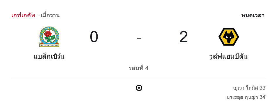 ศึก เอฟเอ คัพ 2024 รอบที่ 4 จบลงด้วยชัยชนะของ วูล์ฟแฮมป์ตัน ที่โชว์ความเหนือชั้น บุกอัด แบล็คเบิร์น โรเวอร์ส 2-0 ส่งทีมจากแชมเปี้ยนชิพร่วงตกรอบเรียบร้อย เกมนี้แข้งหมาป่าเล่นกันอย่างเป็นระบบ โดยเฉพาะแนวรุกที่ทำงานกันได้ดี ขณะที่เจ้าถิ่นแม้จะพยายามบุกสู้ แต่ก็ไม่สามารถเจาะแนวรับของทีมเยือนได้ สุดท้ายต้องจอดแค่รอบนี้ บ้านกีฬา ขอสรุป ผลบอลสด และรายละเอียดสำคัญของเกมให้ได้ติดตามกัน