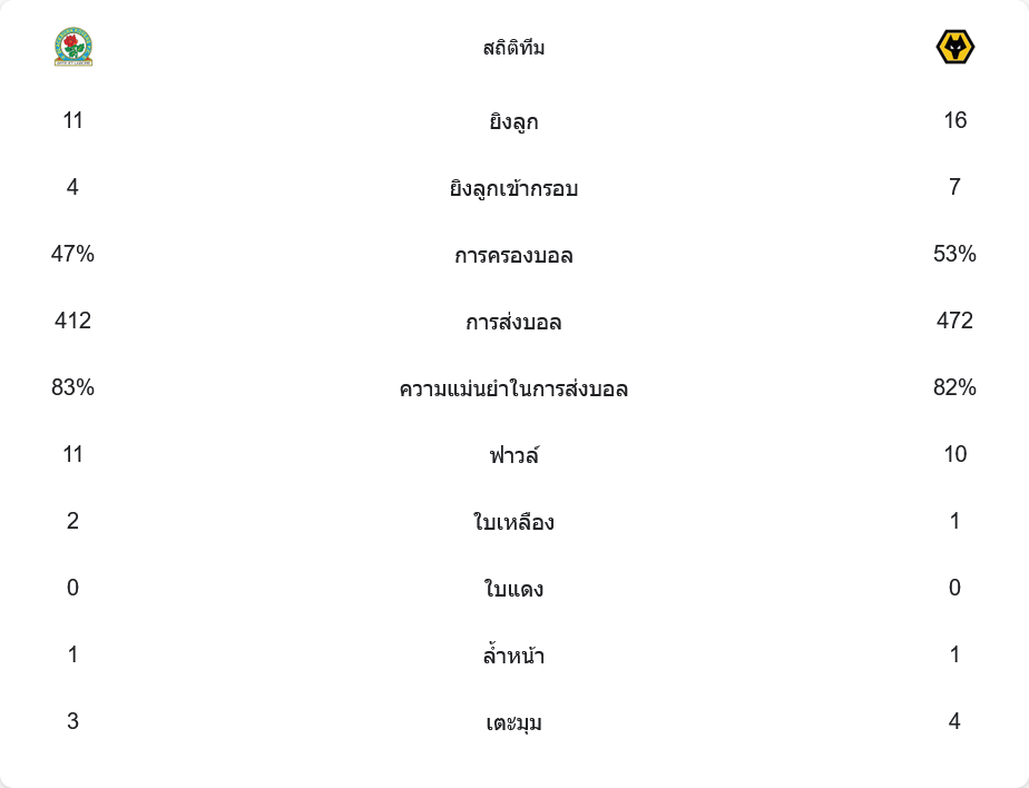 วูล์ฟแฮมป์ตันครองบอลได้มากกว่าเล็กน้อย (53%) และมีโอกาสยิงมากกว่าแบล็คเบิร์น (16 ต่อ 11 ครั้ง) เกมรับของทีมเยือนเหนียวแน่น และมีเปอร์เซ็นต์จ่ายบอลสำเร็จสูงถึง 82% ซึ่งเป็นกุญแจสำคัญที่ทำให้พวกเขาคุมเกมได้ตลอด 90 นาที