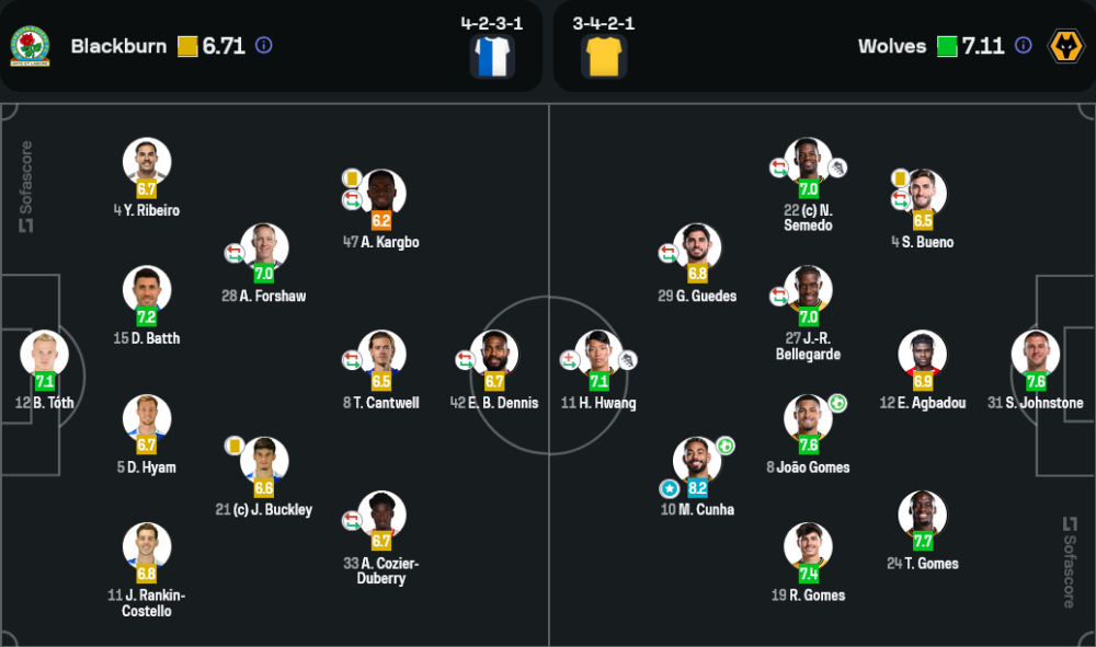 ⭐ มาเธอุส กุนญ่า (8.2/10) – กองหน้าตัวเก่งของวูล์ฟแฮมป์ตันโชว์ฟอร์มสุดยอด ทั้งยิงประตูและสร้างสรรค์เกมรุก เป็นตัวแปรสำคัญที่ทำให้ทีมคว้าชัยในเกมนี้