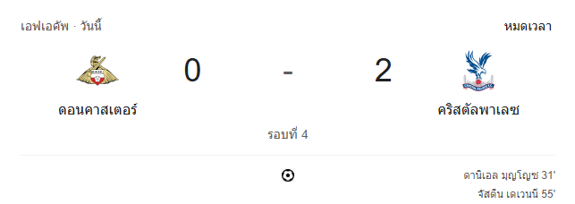 - นาทีที่ 95 กรรมการเป่านกหวีดจบเกม คริสตัล พาเลซเอาชนะดอนคาสเตอร์ โรเวอร์ส 2-0