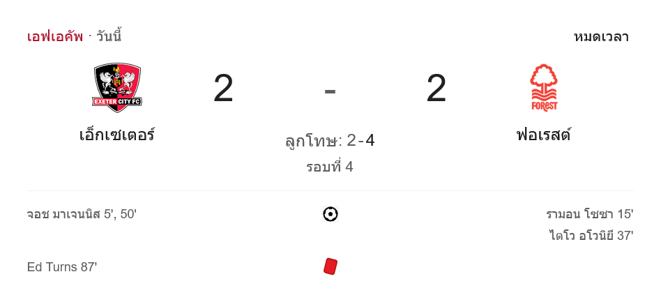 จาก : ผลบอลสด เอฟเอ คัพ 2024 ระหว่าง เอ็กเซเตอร์ ซิตี้ 2-2 น็อตติ้งแฮม ฟอเรสต์ วันนี้ 12/2/68 – บ้านกีฬา