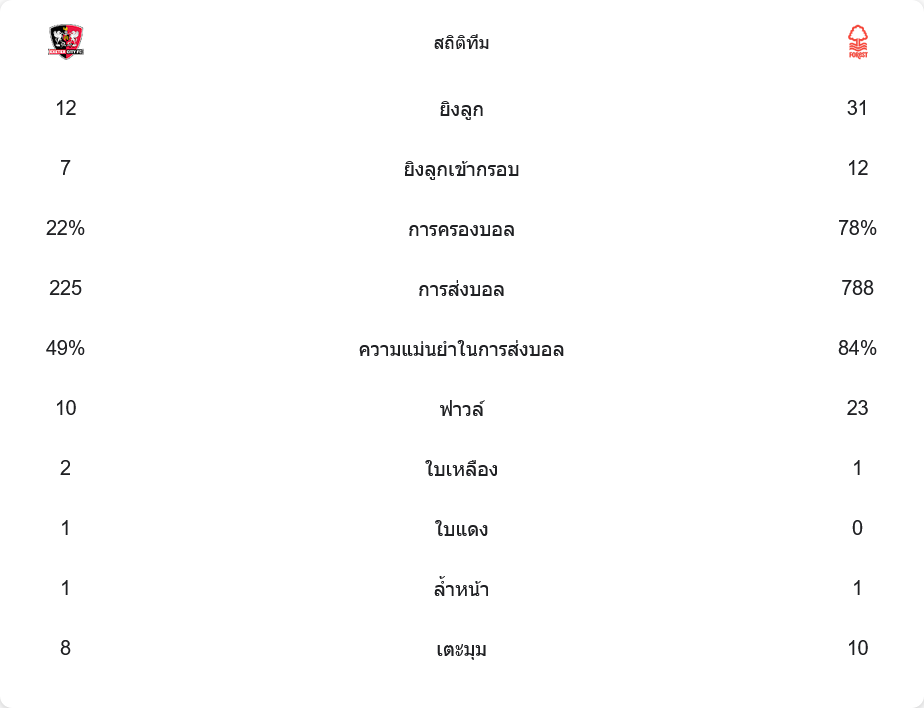 ฟอเรสต์ครองเกมเหนือกว่าอย่างชัดเจนด้วยการครองบอล 78% เทียบกับเอ็กเซเตอร์ที่มีเพียง 22% ฟอเรสต์มีโอกาสยิงถึง 31 ครั้ง ตรงกรอบ 12 ครั้ง ส่วนเจ้าถิ่นมีโอกาสเพียง 12 ครั้ง ตรงกรอบ 7 ครั้ง แสดงให้เห็นถึงพลังเกมรุกของทีมเยือนที่เหนือกว่า