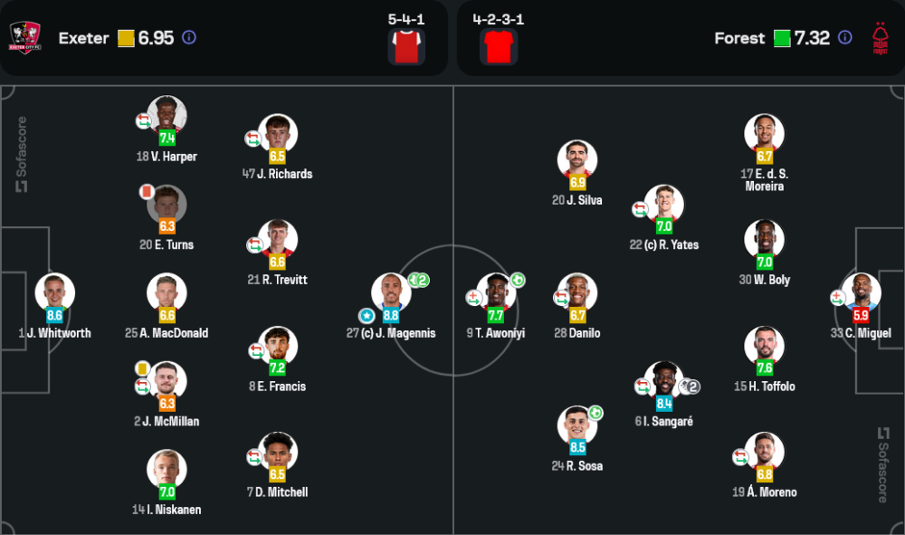 เปิดเกมมาเพียง 5 นาที เอ็กเซเตอร์ ซิตี้ ทำให้แฟนบอลต้องเฮลั่นเมื่อ “จอช มาเจนนิส” ซัดประตูให้เจ้าถิ่นขึ้นนำ 1-0 ตั้งแต่ต้นเกม แต่หลังจากนั้นฟอเรสต์เริ่มตั้งเกมได้และกดดันหนัก จนนาทีที่ 15 “รามอน โซซา” ตีเสมอให้ทีมเยือนเป็น 1-1 จากการแอสซิสต์ของ “อิบราฮิม ซานกาเร่”