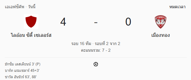 จบเกม ไลออน ซิตี้ เซลเลอร์ส เปิดบ้านถล่ม เมืองทอง ยูไนเต็ด ไป 4-0 รวมผลสองนัดชนะขาด 7-2 ผ่านเข้าสู่รอบต่อไปของศึก เอเอฟซี แชมเปี้ยนส์ลีก ได้อย่างยอดเยี่ยม ขณะที่ เมืองทอง ยูไนเต็ด ต้องยุติเส้นทางของพวกเขาไว้เพียงรอบ 16 ทีมสุดท้าย