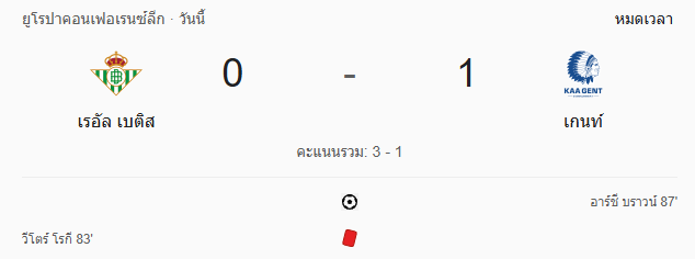 - นาทีที่ 47 กรรมการเป่านกหวีดจบครึ่งแรก เรอัล เบติสเสมอเคเอเอ เกนท์ 0-0