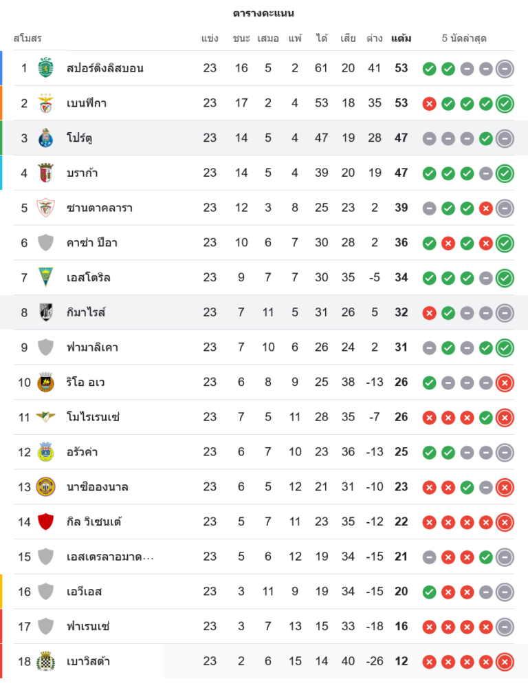 ปอร์โต้สะดุดทำให้มี 47 คะแนน เท่ากับ บราก้า ในอันดับ 4 แต่ยังคงเป็นรองจ่าฝูงอยู่ 6 แต้ม จาก สปอร์ติง ลิสบอน และ เบนฟิก้า ส่วน กิมาไรส์ เก็บเพิ่มเป็น 32 คะแนน ยึดอันดับ 8 และยังมีลุ้นพื้นที่ยุโรป