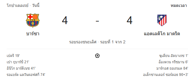 หมดเวลาการแข่งขัน บาร์เซโลน่า 4-4 แอตเลติโก มาดริด ต้องไปตัดสินกันในเลกสอง
