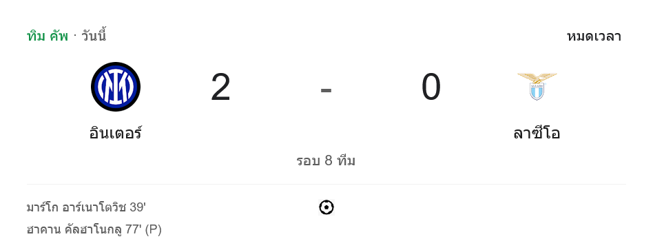 ศึก โกปปา อิตาเลีย 2024 รอบ 8 ทีมสุดท้ายที่สนาม ซาน ซิโร่ จบลงด้วยชัยชนะของ อินเตอร์ มิลาน ที่โชว์ฟอร์มแกร่ง เปิดบ้านปราบ ลาซิโอ ไปแบบหมดจด 2-0 ส่งผลให้ “งูใหญ่” ทะลุเข้าสู่รอบรองชนะเลิศได้สำเร็จ โดยเกมนี้ มาร์โก อาร์เนาโตวิช และ ฮาคาน ชัลฮาโนกลู ช่วยกันซัดคนละตุง พา “เนรัซซูรี่” คว้าชัยอย่างสมศักดิ์ศรี