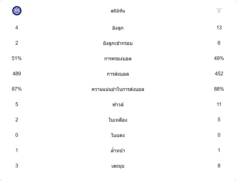 อินเตอร์ มิลาน แม้จะครองบอลเหนือกว่าเล็กน้อย (51%) แต่มีโอกาสยิงน้อยกว่าอย่างชัดเจน (4 ครั้ง) ทว่าพวกเขากลับมีความเฉียบคมกว่าลาซิโอ ที่แม้จะมีโอกาสยิงมากถึง 13 ครั้ง แต่กลับเปลี่ยนเป็นสกอร์ไม่ได้เลย อินเตอร์มีเปอร์เซ็นต์จ่ายบอลสำเร็จที่ 87% ใกล้เคียงกับลาซิโอที่ 88% อย่างไรก็ตาม ทีมเยือนมีสถิติฟาวล์มากถึง 11 ครั้ง และได้รับใบเหลืองถึง 5 ใบ เทียบกับอินเตอร์ที่ฟาวล์เพียง 5 ครั้ง และได้ใบเหลือง 2 ใบ