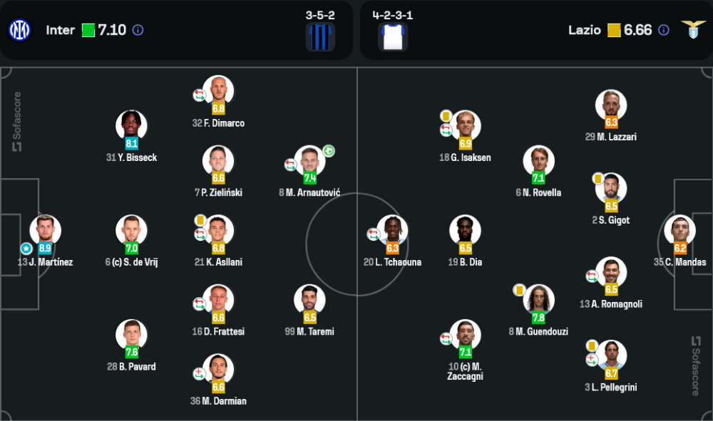 ตัวสำรองที่ลงสนาม: เดนเซล ดุมฟรีส์ (น.24), ฮาคาน ชัลฮาโนกลู (น.63), อเลสซานโดร บาสโตนี (น.64), ฮัวกิน คอร์เรอา (น.64), นิโคโล่ บาเรลล่า (น.84)