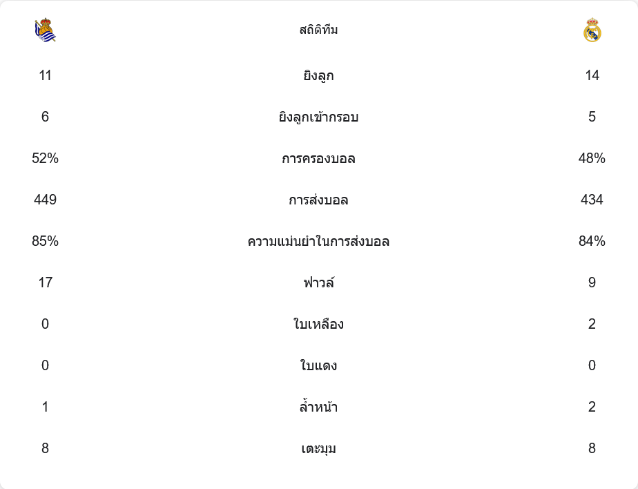 ในเรื่องของการจ่ายบอล ทั้งสองทีมมีสถิติที่ใกล้เคียงกัน โดย โซเซียดาดผ่านบอลสำเร็จ 449 ครั้ง คิดเป็นความแม่นยำ 85% ส่วน มาดริด ผ่านบอล 434 ครั้ง ด้วยความแม่นยำ 84% อย่างไรก็ตาม ทีมเยือนสามารถใช้โอกาสสวนกลับได้ดีกว่า ทำให้เกมนี้พวกเขาเป็นฝ่ายกำชัยชนะ