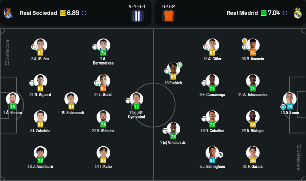 เรอัล มาดริด มาในแผน 4-4-2 ที่เน้นเกมรับแน่นและใช้ความเร็วของ วินิซิอุส จูเนียร์ และ เอ็นดริก ในการโจมตี โซเซียดาดแม้จะครองบอลมากกว่า 52% แต่พวกเขาไม่สามารถเปลี่ยนการครองบอลเป็นโอกาสทำประตูที่ชัดเจนได้ เกมรับของมาดริดที่มี ลูนิน เฝ้าเสาและ รูดิเกอร์-อลาบา คุมหลังบ้าน ถือว่าทำงานได้อย่างไร้ที่ติ