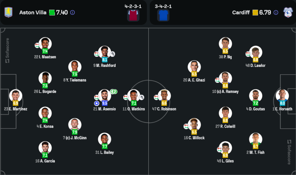 แอสตัน วิลล่า เล่นในระบบ 4-2-3-1 โดยอาศัยการขึ้นเกมจากแดนกลาง ผ่านการเชื่อมบอลของ จอห์น แม็คกินน์ และ ยูริ ตีเลอมันส์ เกมรุกของพวกเขามีความหลากหลาย ทั้งการเจาะริมเส้นจาก เลออน ไบลีย์ และการทำชิ่งตรงกลางระหว่าง อเซนซิโอ้ – แรชฟอร์ด – วัตกิ้นส์ ซึ่งสร้างปัญหาให้แนวรับของ คาร์ดิฟฟ์ ตลอดเกม