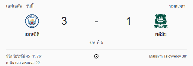 - นาทีที่ 95 วิคเตอร์ เรอิส (แมนฯ ซิตี้) โหม่งจากระยะเผาขน บอลพุ่งข้ามคานออกไป