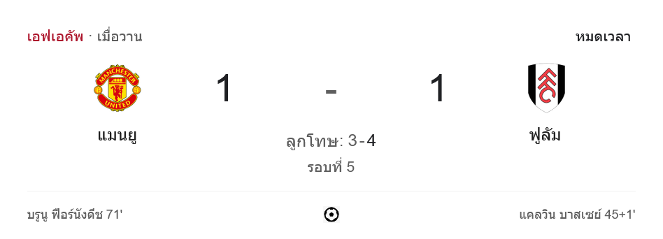 ผลบอลสด ในศึก เอฟเอคัพ 2024 รอบที่ 5 ต้องยกให้กับความมันส์ระดับสิบ! เมื่อ แมนเชสเตอร์ ยูไนเต็ด เปิดบ้านรับการมาเยือนของ ฟูแล่ม ซึ่งจบเกมด้วยการเสมอ 1-1 ก่อนที่ฟูแล่มจะเอาชนะไปได้ในช่วงการดวลจุดโทษ 4-3 ท่ามกลางความตื่นเต้นของแฟนบอลในสนามและผู้ติดตาม บ้านผลบอล ทั่วโลก
