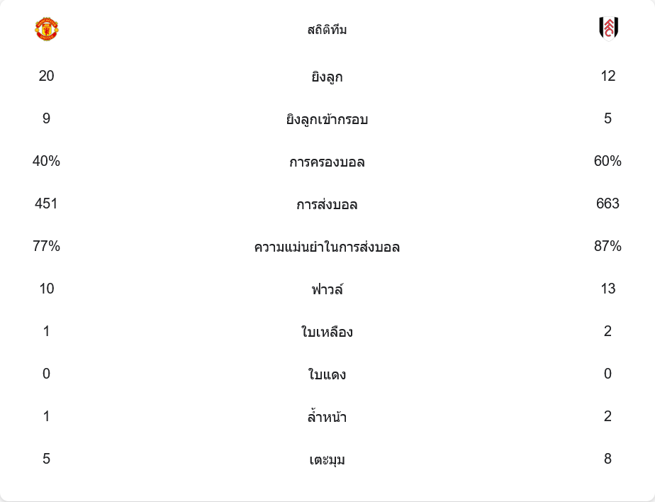แม้ว่าปีศาจแดงจะยิงถึง 20 ครั้ง แต่ฟูแล่มก็ครองบอลได้ดีกว่า 60% และมีการส่งบอลที่แม่นยำถึง 87% เทียบกับ 77% ของแมนเชสเตอร์ ยูไนเต็ด การรับมือของฟูแล่มดูจะมีระเบียบมากกว่า โดยเฉพาะในแดนหลังที่ แบร์นด์ เลโน่ โชว์ฟอร์มยอดเยี่ยม