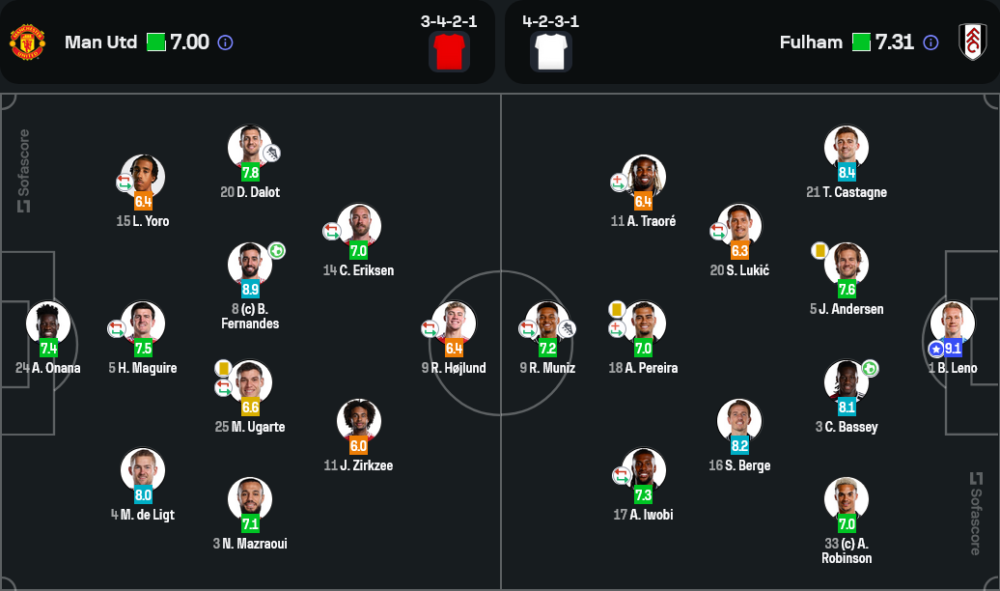 การเปลี่ยนตัว: วิคเตอร์ ลินเดเลิฟ (6.7), อเลฮานโดร การ์นาโช่ (6.1), คาเซมิโร่ (7.7), ชิโด โอบิ-มาร์ติน (5.7), อายเดน ฮีเวน (6.7)