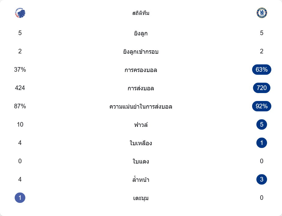 เชลซี ครองบอลได้มากถึง 63% และจ่ายบอลแม่นยำสูงถึง 92% เมื่อเทียบกับ โคเปนเฮเกน ที่ครองบอลเพียง 37% และจ่ายบอลแม่นยำ 87% ทั้งสองทีมยิงเข้ากรอบ 2 ครั้งเท่ากัน แต่เชลซีแสดงให้เห็นถึงการใช้โอกาสได้อย่างมีประสิทธิภาพ การทำฟาวล์เกิดขึ้นทั้งหมด 15 ครั้ง โดย โคเปนเฮเกน ได้รับใบเหลืองมากถึง 4 ใบ
