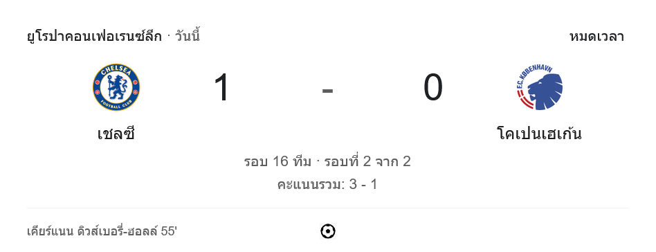 “สิงห์บลูส์” เชลซี คว้าชัยเหนือ เอฟซี โคเปนเฮเก้น 1-0 ในศึก ยูฟ่ายูโรปาคอนเฟอเรนซ์ลีก รอบ 16 ทีมสุดท้าย นัดที่ 2 จากประตูชัยของ เคียร์แนน ดิวส์บิวรี่-ฮอลล์ ช่วยให้ทีมเข้ารอบด้วยสกอร์รวม 3-1 โดย บ้านผลบอล รายงานว่า เชลซี ครองเกมได้เหนือกว่า แต่ต้องออกแรงไม่น้อยกว่าจะเจาะแนวรับทีมเยือนได้สำเร็จในครึ่งหลัง