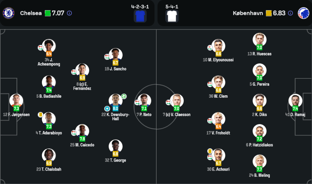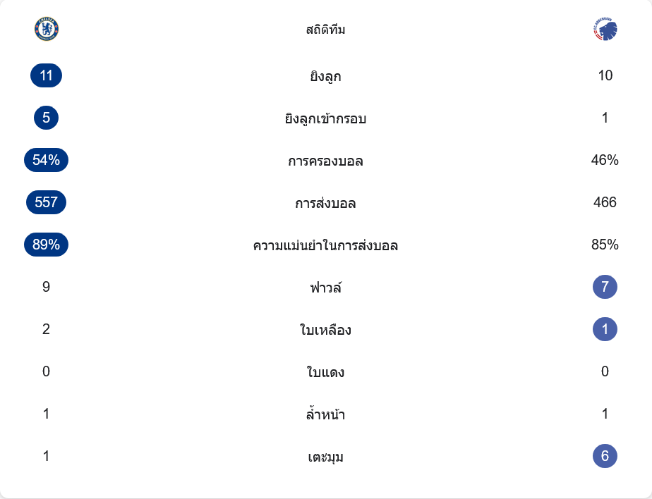 แม้ว่า โคเปนเฮเก้น จะมีโอกาสยิง 10 ครั้ง แต่มีเพียง 1 ครั้งที่เข้ากรอบ ต่างจาก เชลซี ที่มีถึง 5 ครั้งจากทั้งหมด 11 ครั้ง ขณะที่เปอร์เซ็นต์ครองบอลของเชลซีอยู่ที่ 54% เทียบกับ 46% ของทีมเยือน ด้านการส่งบอลเจ้าถิ่นทำได้ 557 ครั้ง โดยมีความแม่นยำ 89% ส่วนทีมเยือนส่งบอล 466 ครั้ง แม่นยำ 85%