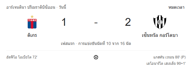 บ้านกีฬา พาคุณเกาะติด ผลบอลสด ศึก อาร์เจนติน่า พรีเมียร์ดิวิชั่น 2024 ที่สนามเหย้าของ ติเกร ต้องรับศึกหนักจาก เซนทรัล คอร์โดบา แม้เจ้าบ้านจะขึ้นนำก่อน แต่สุดท้ายโดนทีเด็ดของทีมเยือนที่พลิกเกมช่วงท้าย คว้าชัยไป 2-1 ในเกมที่เต็มไปด้วยความเข้มข้นตั้งแต่นาทีแรกจนกระทั่งสิ้นเสียงนกหวีดสุดท้าย