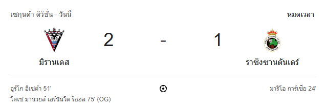 - หมดครึ่งแรก: มิรานเดส 0-1 ราซิ่ง ซานตานเดร์