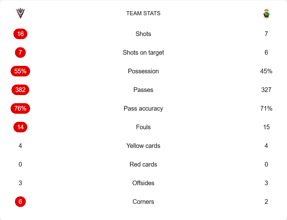 แม้มิรานเดสจะครองบอลเพียง 55% แต่พวกเขาสร้างโอกาสยิงถึง 16 ครั้ง เข้ากรอบ 7 ครั้ง ขณะที่ ราซิ่ง มีโอกาสยิงเพียง 7 ครั้ง เข้ากรอบ 6 ครั้งแต่เปลี่ยนเป็นประตูได้ลูกเดียว จำนวนการจ่ายบอลของเจ้าถิ่นอยู่ที่ 382 ครั้ง ด้วยความแม่นยำ 76% ส่วนทีมเยือนจ่ายบอลไป 327 ครั้ง แม่นยำ 71% ฟาวล์ใกล้เคียงกันโดยมิรานเดสทำ 14 ครั้ง ราซิ่ง 15 ครั้ง ทั้งสองทีมได้รับใบเหลืองเท่ากันที่ 4 ใบ แต่ไม่มีใบแดงใด ๆ เกิดขึ้นในเกมนี้ ลูกเตะมุมเจ้าถิ่นมากกว่าชัดเจนที่ 6 ต่อ 2