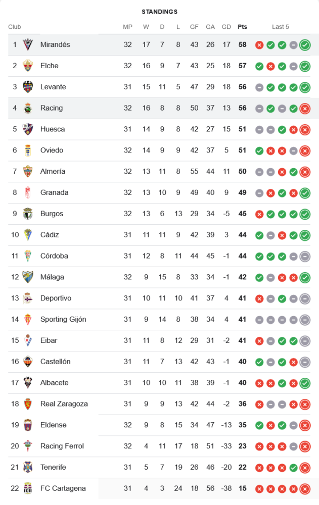 ชัยชนะนัดนี้ส่งผลให้ มิรานเดส แซงขึ้นรั้งจ่าฝูงของตารางด้วย 58 แต้มจาก 32 นัด นำหน้ารองจ่าฝูง เอลเช่ เพียงแต้มเดียว ขณะที่ ราซิ่ง ซานตานเดร์ หล่นมาอันดับ 4 ร่วมกับเลบันเต้ที่มี 56 คะแนนเท่ากัน แต่ประตูได้เสียของราซิ่งยังเป็นรอง ทั้งสองทีมยังอยู่ในเส้นทางลุ้นเลื่อนชั้นอย่างสูสี