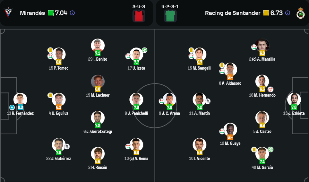 ด้าน ราซิ่ง มาในแผน 4-2-3-1 โดยเน้นการครองบอลแดนกลางและรุกจากแนวลึก อาราน่า เล่นเป็นหัวหอกเดี่ยวแต่กลับโดนประกบตลอด ส่วนปีกทั้ง มาร์ติน และ ซังกัลลี่ พยายามลากตัดเข้าในแต่โดนจำกัดพื้นที่ตลอด เกมรับมีจุดอ่อนในจังหวะลูกเซ็ตพีซและความผิดพลาดของมานู เอร์นันโดที่ทำเข้าประตูตัวเองในจังหวะกดดันอย่างน่าเสียดาย ซึ่งจากการ วิเคราะห์บอล เกมนี้ มิรานเดสคมกว่าในจังหวะที่สำคัญและเฉียบขาดในแดนสุดท้าย