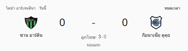 ศึกฟุตบอล โคปา อาร์เจนติน่า วันนี้ที่สนามกลาง บ้านกีฬาเกาะติด ผลบอลสด คู่สุดมันระหว่าง ซาน มาร์ติน ซาน ฮวน พบ กิมนาเซีย คูคุย ซึ่งทั้งสองทีมเล่นกันอย่างสูสีตลอด 90 นาที ก่อนต้องตัดสินกันด้วยการดวลจุดโทษ และเป็น ซาน มาร์ติน ที่แม่นกว่า เอาชนะไป 3-0 ในการดวลโทษ หลังเสมอกันในเวลา 0-0