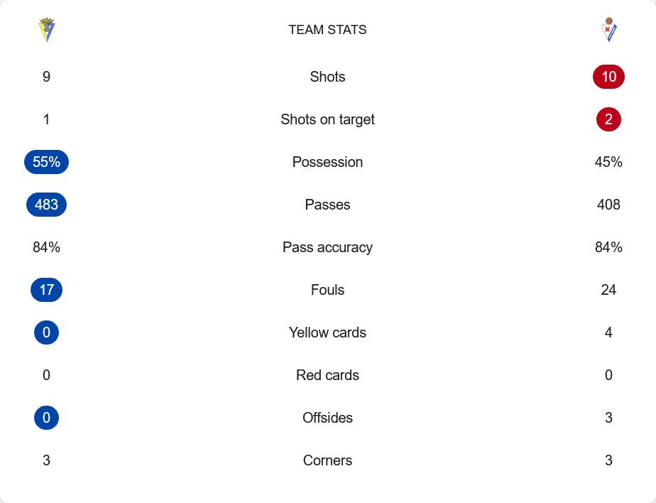 สำหรับการ วิเคราะห์บอล ในเกมนี้ กาดิซ ครองบอลได้มากกว่า (55%) และมีการผ่านบอลที่แม่นยำ (84%) แต่โอกาสยิงเข้ากรอบทำได้เพียงครั้งเดียวจากการยิงทั้งหมด 9 ครั้ง ขณะที่ เออิบาร์ ครองบอลน้อยกว่า (45%) แต่มีโอกาสยิงเข้ากรอบมากกว่า (2 ครั้ง) จากการยิงทั้งหมด 10 ครั้ง เกมรับของทั้งสองทีมทำได้ดี โดยเฉพาะฝั่ง กาดิซ ที่มีการป้องกันจาก Víctor Chust ที่ทำผลงานโดดเด่นจนได้รับตำแหน่ง Player of the Match ไป