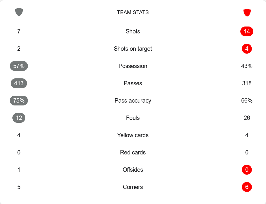 อย่างไรก็ตาม การเล่นเกมรุกของพวกเขายังขาดความเฉียบคม โดยสามารถยิงได้เพียง 7 ครั้ง และมีโอกาสยิงเข้ากรอบเพียง 2 ครั้ง เท่านั้น ขณะที่ทีมเยือน โอเตลุล กาลาติ แม้จะครองบอลน้อยกว่าที่ 43% และผ่านบอลได้เพียง 318 ครั้ง ด้วยความแม่นยำ 66% แต่กลับมีโอกาสทำประตูได้มากกว่าอย่างเห็นได้ชัด โดยพวกเขายิงทั้งหมด 14 ครั้ง และสามารถยิงเข้ากรอบได้ถึง 4 ครั้ง ซึ่งทำให้พวกเขาได้ประตูขึ้นนำในช่วงต้นเกมและปิดเกมได้อย่างยอดเยี่ยม