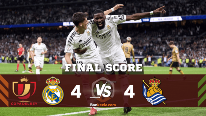 นี่คือหนึ่งในเกม โกปาเดลเรย์ ที่เข้มข้นที่สุดในรอบหลายปี เรอัล มาดริด แสดงให้เห็นถึงความไม่ยอมแพ้ ไล่ตามตีเสมอในเกมที่เต็มไปด้วยแรงกดดันทุกนาที จบด้วยผล 4-4 และสกอร์รวม 5-4 เข้ารอบไปอย่างสุดระทึก ด้าน เรอัล โซเซียดาด ต้องยอมรับว่าเล่นได้ยอดเยี่ยม แต่สุดท้ายไม่อาจหยุดความฮึดของราชันชุดขาวได้
