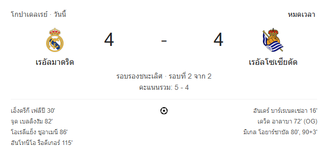 - นาที 120+3: จบเกม! บ้านกีฬา รายงานผลบอลสด มาดริด 4-4 โซเซียดาด รวมผล 5-4 เข้าชิงสุดมันส์!