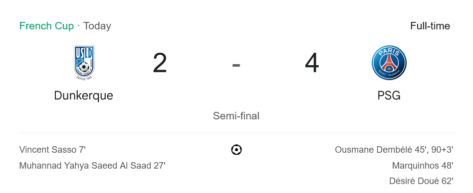 การแข่งขัน เฟร้นช์คัพ 2025 รอบรองชนะเลิศ ระหว่าง เดิงแกร์ก์ และ ปารีส แซงต์-แชร์กแมง (เปแอสเช) จบลงด้วยชัยชนะของยักษ์ใหญ่จากเมืองหลวง ที่บุกไปถล่มเจ้าบ้านด้วยสกอร์ 4-2 เกมนี้ อุสมาน เดมเบเล่ โชว์ฟอร์มเทพ ยิงไปสองประตู พร้อมคว้ารางวัล Player of the Match ไปครอง