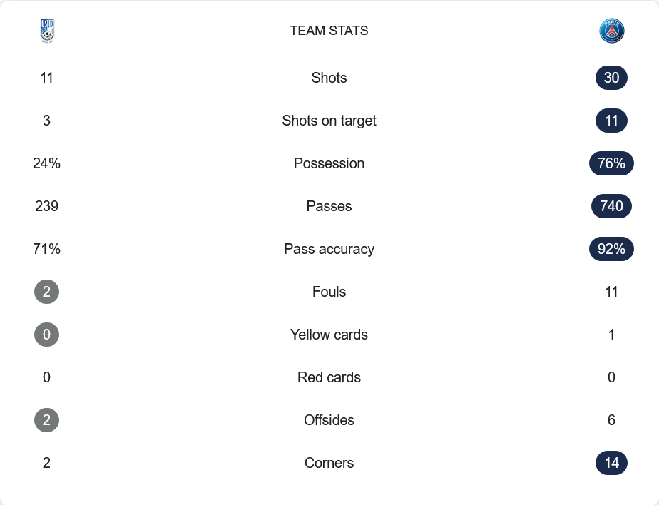 เกมนี้ เปแอสเช ใช้แผนการเล่น 4-3-3 เน้นการครองบอลในแดนกลางและโจมตีจากริมเส้นด้วยความเร็วของ อุสมาน เดมเบเล่ และ บราเดลลี่ บาร์โคล่า โดยมี มาร์กินโญส คอยคุมเกมรับอย่างเข้มแข็ง ด้วยการผ่านบอลที่แม่นยำถึง 92% และโอกาสยิงมากถึง 30 ครั้ง ทำให้พวกเขาควบคุมเกมได้อย่างชัดเจน
