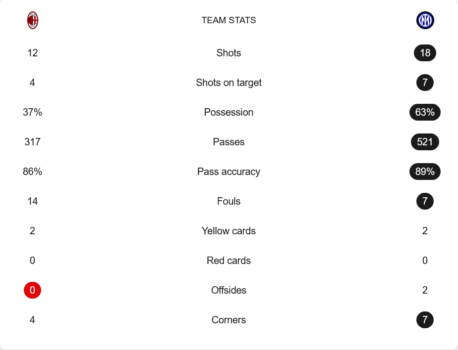 แม้ว่า อินเตอร์ มิลาน จะครองบอลได้มากกว่าอย่างชัดเจน (63%) และมีจำนวนการผ่านบอลมากถึง 521 ครั้ง แต่ เอซี มิลาน กลับสามารถทำประตูขึ้นนำได้ก่อนในครึ่งหลัง ซึ่งแสดงให้เห็นถึงประสิทธิภาพของการเล่นโต้กลับอย่างยอดเยี่ยมของพวกเขา