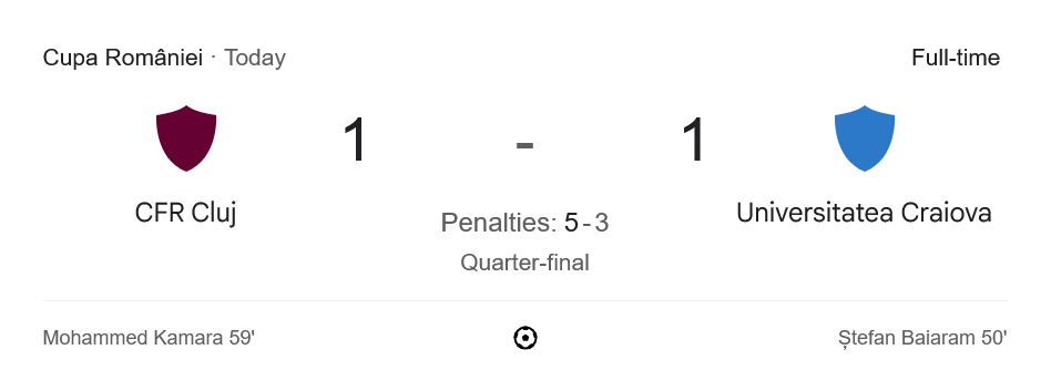 ศึกฟุตบอล โรมาเนีย คัพ 2025 รอบก่อนรองชนะเลิศ ระหว่าง ซีเอฟอาร์ คลูจ์ และ ซีเอส คราอิโอว่า ที่จัดขึ้นเมื่อค่ำคืนที่ผ่านมา เป็นอีกหนึ่งเกมที่เต็มไปด้วยความเข้มข้น และการต่อสู้ที่ดุเดือดตั้งแต่ต้นจนจบ ผลบอลสด ในนัดนี้จบลงด้วยการเสมอ 1-1 ในเวลา ก่อนที่ ซีเอฟอาร์ คลูจ์ จะเฉือนชนะการดวลจุดโทษไปได้ 5-3
