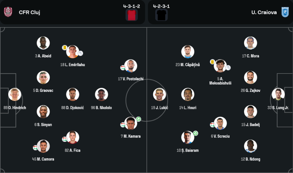 ด้าน ซีเอส คราอิโอว่า ที่ใช้ระบบ 4-2-3-1 เน้นการตั้งรับและรอสวนกลับ แต่การประสานงานระหว่างกองกลางตัวรุกและกองหน้ายังขาดความแม่นยำ การเล่นในแดนกลางที่ขาดความต่อเนื่องทำให้พวกเขาไม่สามารถเจาะแนวรับของ ซีเอฟอาร์ คลูจ์ ได้อย่างที่ต้องการ
