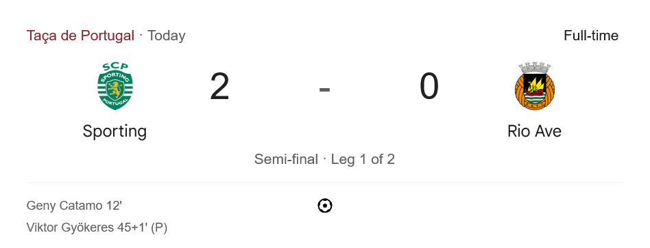 เกมนี้ถือเป็นการแข่งขันที่แฟนบอลต่างจับตามองในศึก โปรตุเกส คัพ 2025 รอบรองชนะเลิศ นัดแรก ที่สนามเหย้าของ สปอร์ติ้ง ลิสบอน พบกับ ริโอ อาฟ ผลงานอันดุดันของเจ้าบ้านทำให้พวกเขาเก็บชัยชนะไปได้แบบเด็ดขาดด้วยสกอร์ 2-0 สร้างความได้เปรียบก่อนเกมนัดที่สองไปได้อย่างยอดเยี่ยม