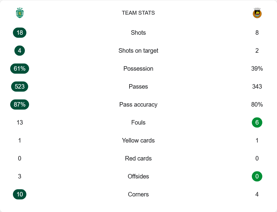 เกมนี้ สปอร์ติ้ง ลิสบอน มีโอกาสยิงทั้งหมด 18 ครั้ง โดยเข้ากรอบ 4 ครั้ง มีเปอร์เซ็นต์การครองบอลอยู่ที่ 61% จากการผ่านบอลทั้งหมด 523 ครั้ง ความแม่นยำในการผ่านบอลสูงถึง 87% ขณะที่ ริโอ อาฟ ยิงทั้งหมด 8 ครั้ง เข้ากรอบ 2 ครั้ง การครองบอลอยู่ที่ 39% จากการผ่านบอล 343 ครั้ง