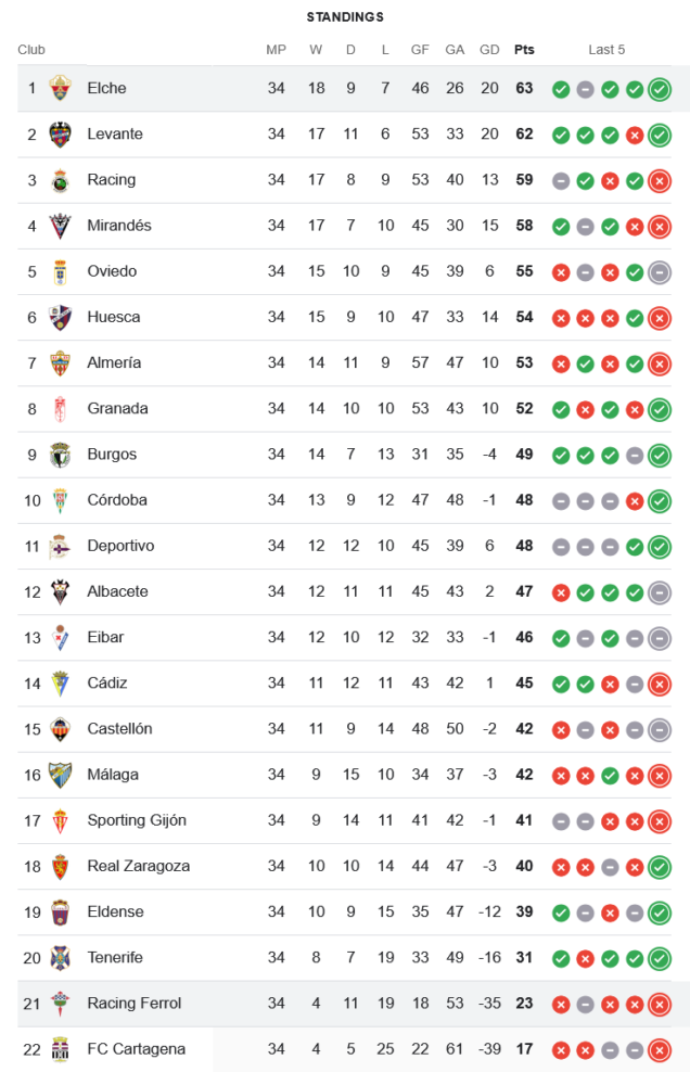 ชัยชนะครั้งนี้ทำให้ เอลเช่ ยังคงรั้งอันดับ 1 ของตาราง มี 63 คะแนน จาก 34 นัด โดยนำหน้า เลบันเต้ ที่มี 62 คะแนน อยู่เพียง 1 คะแนน ขณะที่ เรซซิ่ง เดอ เฟอรอล ยังจมอยู่ในโซนตกชั้นที่อันดับ 21 ด้วยคะแนนเพียง 23 คะแนน