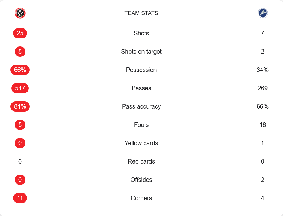 แม้จะพ่ายในเกมนี้ แต่เชฟฟิลด์ ยูไนเต็ดมีสถิติที่เหนือกว่าทุกด้าน โดยมีโอกาสยิงมากถึง 25 ครั้ง เข้ากรอบ 5 ครั้ง ขณะที่มิลล์วอลล์ยิงเพียง 7 ครั้ง และตรงกรอบแค่ 2 ครั้ง การครองบอลอยู่ที่ 66% ต่อ 34% โดยฝั่งเจ้าถิ่นต่อบอลมากถึง 517 ครั้ง มีความแม่นยำถึง 81% เทียบกับมิลล์วอลล์ที่จ่ายเพียง 269 ครั้ง และแม่นยำ 66% นอกจากนี้ เชฟฟิลด์ ยังได้เตะมุมมากถึง 11 ครั้ง แต่เปลี่ยนเป็นประตูไม่ได้เลย ฟาวล์รวมของมิลล์วอลล์มากถึง 18 ครั้ง เทียบกับเพียง 5 ของเจ้าถิ่น ใบเหลืองเกิดขึ้นหนึ่งใบในช่วงทดเวลา