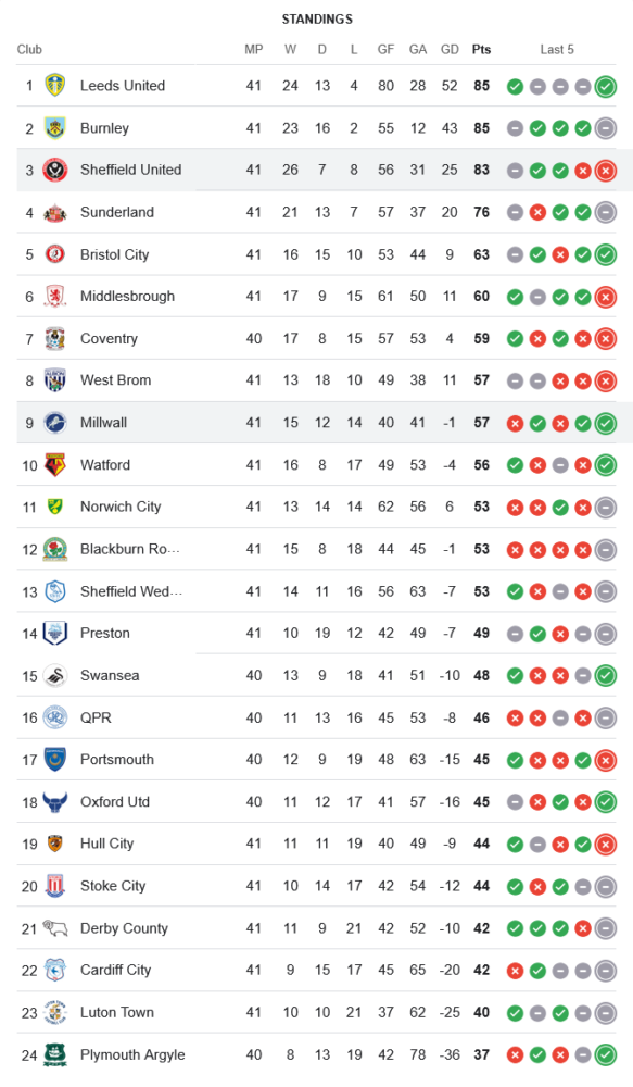 แม้จะพ่ายคารังแต่ เชฟฟิลด์ ยูไนเต็ด ยังรั้งอันดับ 3 ของตารางด้วย 83 คะแนน ตามหลังจ่าฝูง ลีดส์ และเบิร์นลีย์ เพียง 2 แต้ม แต่โอกาสในการลุ้นแชมป์เริ่มลดลงเพราะสะดุดมา 2 นัดติด ส่วน มิลล์วอลล์ เก็บเพิ่มเป็น 57 แต้ม ขยับขึ้นอันดับ 9 และยังมีลุ้นเบียดพื้นที่เพลย์ออฟได้อย่างเข้มข้นในช่วง 5 นัดสุดท้าย