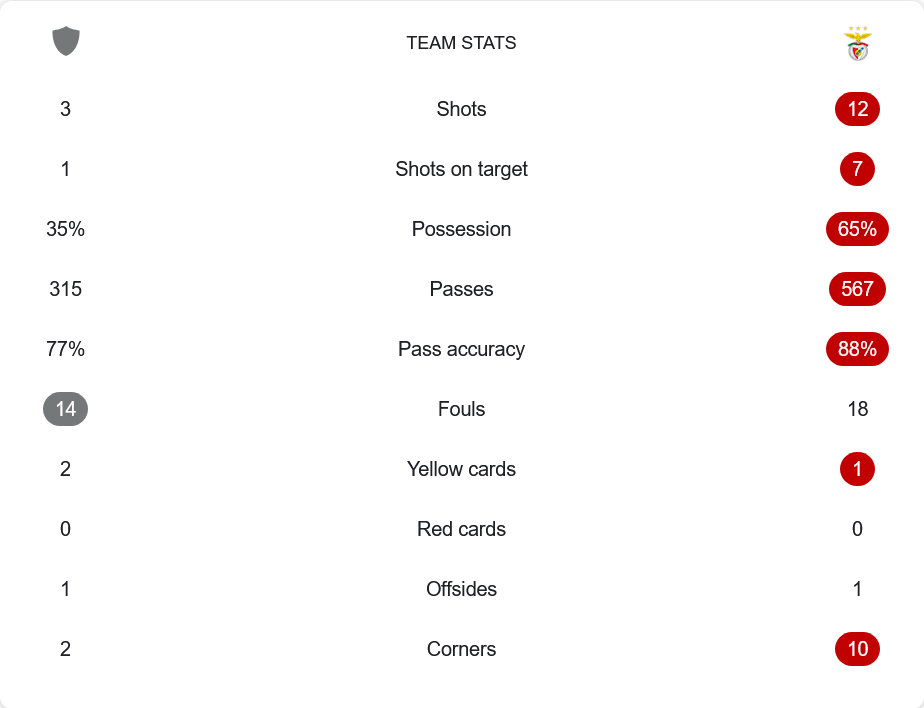เบนฟิก้าครองบอลเหนือกว่าชัดเจนด้วยเปอร์เซ็นต์ 65% ต่อ 35% และจ่ายบอลถึง 567 ครั้งด้วยความแม่นยำถึง 88% ขณะที่ Tirsense มีเพียง 315 ครั้ง และความแม่นยำเพียง 77% ในการครองบอล เจ้าบ้านยิงได้เพียง 3 ครั้งเข้ากรอบ 1 ครั้ง ขณะที่ทีมเยือนบุกหนักตลอดทั้งเกมยิงถึง 12 ครั้ง และเข้ากรอบ 7 ครั้ง การฟาวล์รวมสูงถึง 32 ครั้ง โดย Tirsense ทำไป 14 และเบนฟิก้า 18 ใบเหลืองแจกให้เจ้าถิ่น 2 ใบ และทีมเยือน 1 ใบ เตะมุมเบนฟิก้าทะลุถึง 10 ครั้ง สวนทางกับ Tirsense ที่ได้แค่ 2