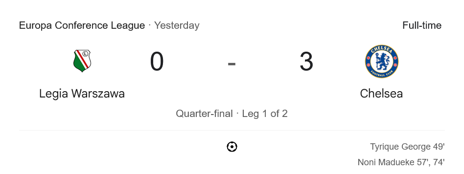เชลซี จะกลับไปเปิดบ้านที่สแตมฟอร์ด บริดจ์เพื่อลงเตะนัดที่สองกับ ลีเกีย วอร์ซอว์ ในวันที่ 18 เมษายน 2568 เวลา 02:00 น. ในศึกยูฟ่าคอนเฟอเรนซ์ลีก รอบ 8 ทีมสุดท้าย หลังจากที่นัดแรกบุกไปตบเจ้าบ้านมา 3-0 แบบขาดลอย แม้สถานการณ์จะดูเข้าทางสิงห์บลูส์ แต่ยังต้องเล่นให้รัดกุมเพื่อไม่ให้พลาดในบ้านตัวเอง ติดตามโปรแกรมและการถ่ายทอดสดได้ที่หน้า ตารางบอล บ้านกีฬา ที่อัปเดตทุกความเคลื่อนไหวของเวทียุโรปแบบทันใจ
